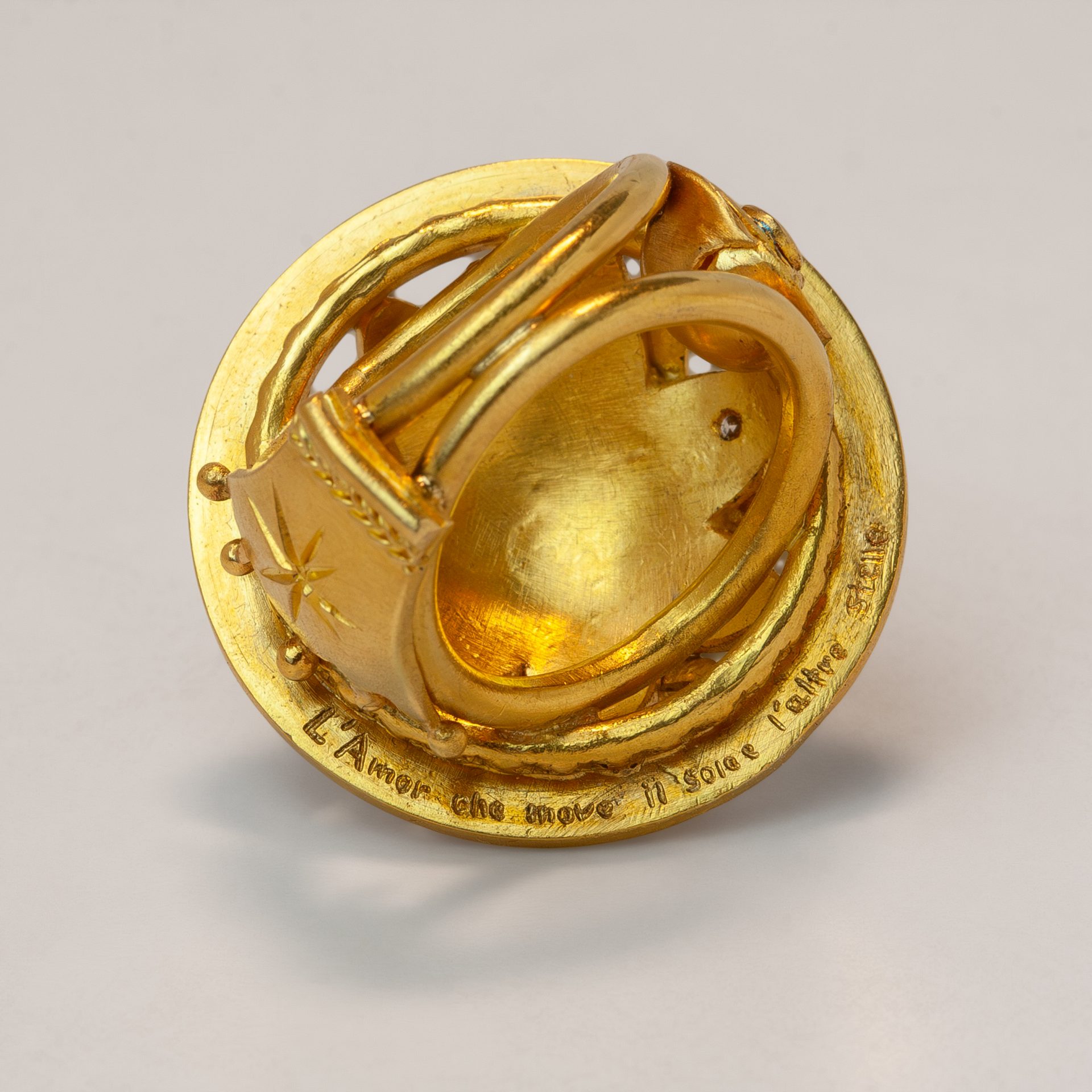Reluctantly, I handed it back. Then, she put on surgical gloves and took out her magnum opus–this extraordinary love ring. This piece embodies, and includes, the final words of Dante’s epic: “The Love that moves the sun and the other stars.”