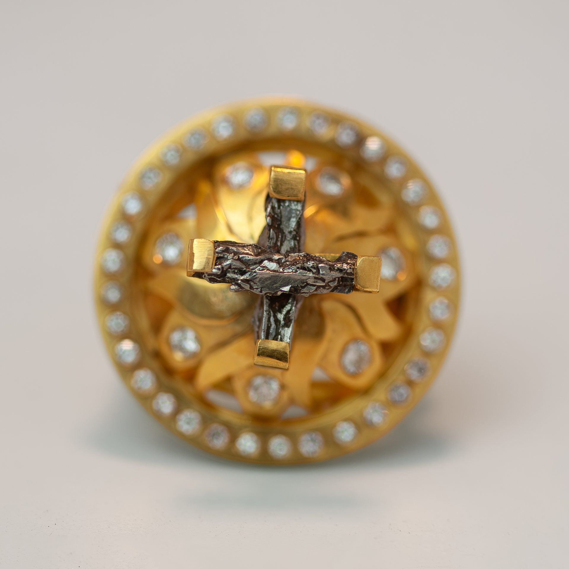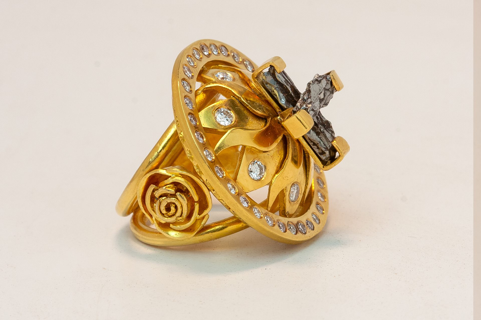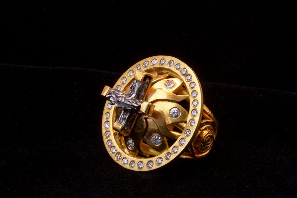 Saiber continues, “Created in 2012 and first exhibited in New York City’s Forbes Galleries in March of 2013, Distefano’s Love ring is a wonder—a unique blend of beauty, science, exquisite materials, and exceptional craftsmanship. Its thirty-three diamonds symbolize each of the cantos in the Paradiso. Other elements familiar to Dante’s readers are the flame and the rose. At the center of the ring is a cross or a plus-sign, set with shards from the Gibeon meteorite that fell to earth in Namibia in 1838. Inscribed inside the ring are Dante’s words, ‘The Love That Moves the Sun and the Other Stars.'”