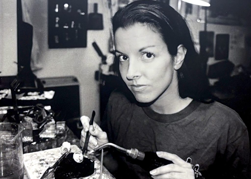 Distefano is one of those exceptional individuals in whom intellect and artistry converge—and then ignite. Her atelier is in a landmark industrial building so far west in New York’s Chelsea district that it is practically in the Hudson River. When I arrived at her workshop, two apprentices were at their stations, crafting medieval gold chains. The large, daylit room was filled with vitrines containing the artist’s work.