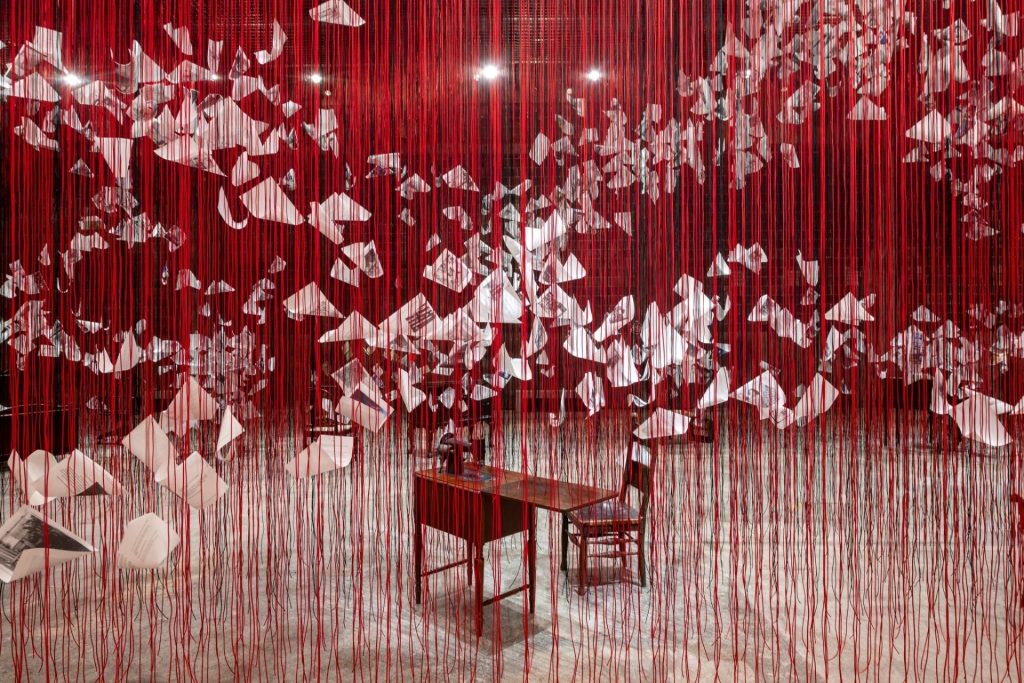Home Less Home features a field of red and black ropes in the shape of a house. Here, Shiota suspends important documents—passports, immigration papers, letters and messages from family or friends. She adds beds, desks, chairs, and tables to indicate a sense of arrival. And also to show the basic building blocks we used to create our homes. However, this place is deliberately ambiguous, and the viewer feels suspended between one place and the next. It’s the opposite of a bee frozen in amber. This is more like being trapped in space. We are neither here not there. And forever in transit from one place to another.
